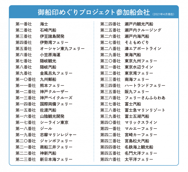 乗船者や港に訪れた人が御船印の発行料を支払い、船印帳に集めて日本各地の船をめぐる旅です。御船印を発行する参加社は、北は北海道から南は九州の鹿児島まで、全国46社が順次開始。今後も参加社は増えていく予定です。