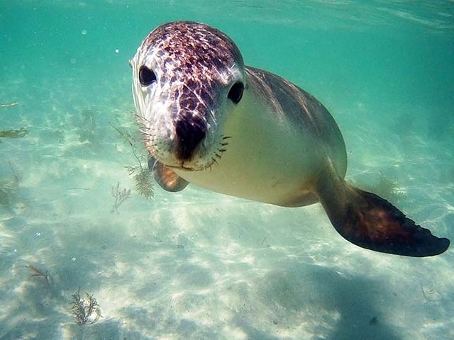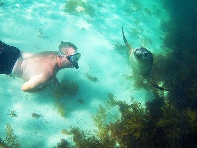 サバンテスの北にある美しい白砂のビーチをもつリゾートタウンがジュリアンベイ。この沖合に浮かぶ小島はオーストラリアアシカが数多く生息しています。ジュリアンベイから数社がアシカと泳ぐツアーを催行。船でわずか15分ほどで小島の周りに到着。スノーケリングで海に入ると、好奇心いっぱいのアシカがすぐ近くまで来てくれます。顔を近づけてきたり、ぐるぐると周りを泳いでくれたり……あまりの愛らしさに、海の中なのに思わず声を上げたくなるほどです。