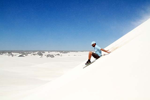 ターコイズコーストの南側のリゾートタウン、ランセリンは白砂のビーチはもちろん、町の裏手に広がる巨大砂丘も見逃せません。砂丘内を大型4WDで駆け巡るツアーがあったり、4輪バギー(ATV)を借りて砂丘内を走り回ったり、いろいろな楽しみ方があります。特に人気なのが砂丘でのサンドボーディング――つまり砂滑り。砂丘入口にボードレンタルがあるので、借りて目の前の大きな砂の丘を目指しましょう! うまく滑ることができると、最高の爽快感! また4WDツアーに参加すれば、ほとんど人が入ってこない巨大な丘でのサンドボーディングも満喫できます。