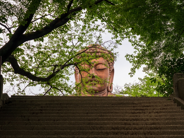 初期鉄筋コンクリート造ということのほかに、注目すべきは大仏の顔です。建立者の山田才吉は、大仏の顔の造形にこだわっており、じつは一度完成した顔を作り直させています。また大仏の体の比率と比べて、頭を大きくしたのは、下から見上げた際の視覚的バランスを取るためです。