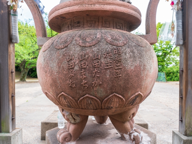 大仏と仁王像のほかに、境内に残る大灯籠、常香炉、参道も建立当時からのものです。大灯籠には山田才吉の前妻だった「山田なつ」の名前が刻まれ、常香炉には後妻「山田よね」をはじめ家族の名前が残されています。大仏自体は鉄筋コンクリート造ですが、これら付属設備は人造石により作られており、産業史的な視野からも貴重な遺産となっています。
