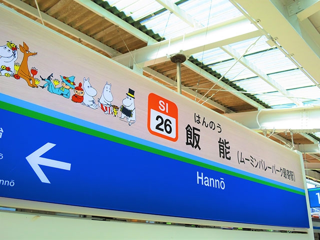 ゲートウェイとなる駅は、西武線の飯能駅。「ムーミンバレーパーク・メッツァビレッジ」へのバスも運行しているこの駅は、電車を降りた途端、北欧のテイストにあふれています。ホームの駅名標も、ほら、ムーミンがかわいくお出迎え♡