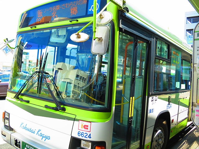 改札を出ると出口が左右に分かれていますが、駅の北口へ向かいます。そこにバス乗り場があり、ノーラ名栗へ行くには3番乗り場から、国際興業バス名栗車庫・名郷・湯の沢行きなどに乗っていきます。本数はさほど多くないので、あらかじめ時間を調べていきましょう。飯能の街中を過ぎると、バスはどんどん緑深い里山へ。透明度が高く、澄んだ水が美しい入間川に添うようにバスは進んでいきます。約40分で、バス停「ノーラ名栗・さわらびの湯」に到着!