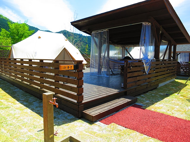 グランピングエリアはかなりゆったりとしており、その中に建物が10棟点在しています。各客室はテラス付きになっており、テーブルセットのある食事スペースや、ハンモックまで用意されています。