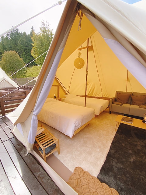 室内にはソファやテーブルまで置かれており、優雅な時間を過ごせます。また周辺は山の気候なので、朝晩は冷えることがありますが、冷暖房機があるのでその点も安心です。さらに冷蔵庫に加え、空気清浄機まで完備。天井も高いテントなので、立っていても圧迫感がなく、室内でも快適に過ごせました。もちろんWifiも完備です。