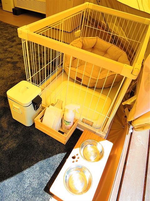 10張のテントのうち、2張のテントは犬も同伴可能。テラス部分にケージで囲った犬用スペースが設けられているほか、テント内にもケージが置かれています。おしゃれな水飲み皿&餌皿にペットシーツ処理用のダストボックスなど、至れり尽くせりの犬用グッズが揃えられています。