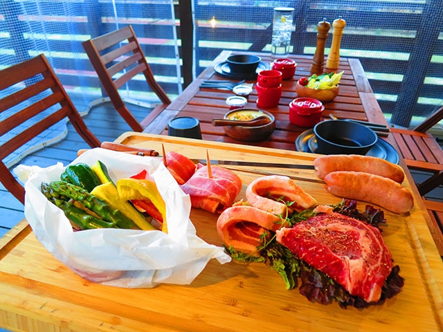 食事は、テラスにある屋根付きスペースで。ここにガスグリルが設置してあり、夕食のバーベキューも自分たちだけで調理が可能です。アメリカンスタイルのバーベキューが可能なweberのグリルですが、点火はボタンを回すだけ。火加減の調節も可能なので、自分たち好みの焼き加減に仕上げることができます。そして、このグリル、肉などから滴り落ちるドリップをキャッチして焼き、食材に風味をプラスするスモークを出すというすぐれもの。夕食の肉料理が柔らかさもちょうどよく焼き上がり、風味豊かだったのはいうまでもありません!