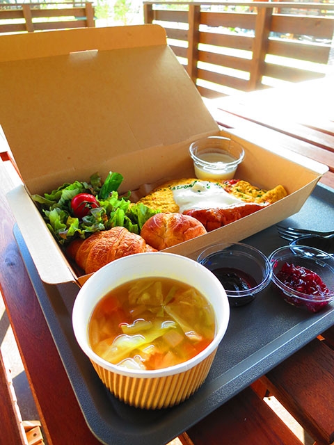 朝食はチェックイン時に希望の時間を伝えると、食事スペースにブレックファストBOXが届けられます。この日のメニューはオムレツを中心に名物のグリッリ・マッカラというソーセージやヨーグルト、スープ、サラダ、パン、ジャムなどが付いていました。グリッリ・マッカラとは、フィンランドで食べられるグリル・ソーセージのこと。マスタードを付けてビールとともに食べるのが、フィンランドの夏の定番です。飲み物はファイヤープレイス近くに、フリードリンクスペースが設けられており、2種のジュースにアイスとホットのコーヒー、リンゴンベリーティーなどが用意されているので、そこから好きなだけ飲み物を運んでくることが出来ます。もちろん起きたてのモーニングコーヒーなども可能です。