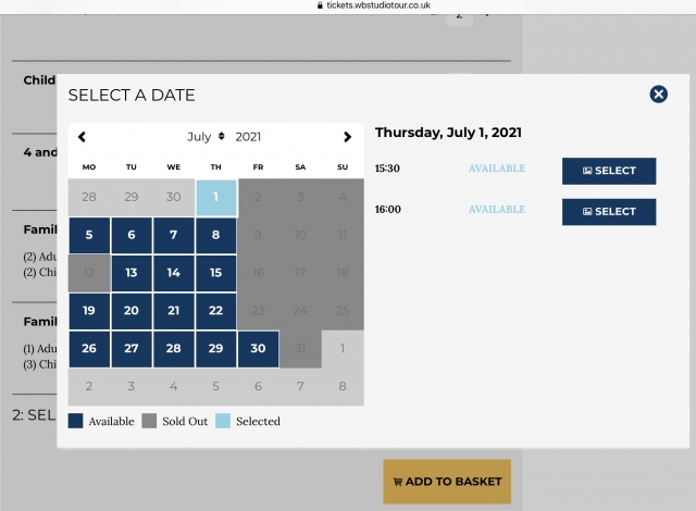 16歳以上の「大人」がひとり£47、子供料金やファミリー割引、そのほか各種ガイドブックがついたお得なパッケージ料金もあります。黄色い「Book Now」ボタンを押してチケットの種類と日にちを選択します。
