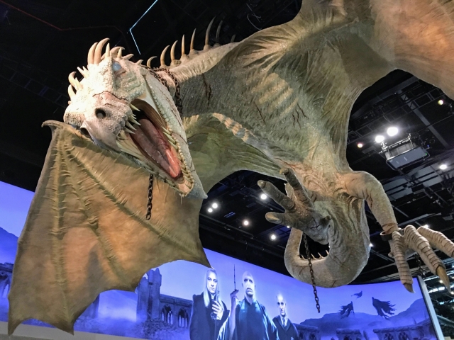 ロビーホールに一歩踏み入ると、高い天井からつり下げられた『ハリー・ポッター』シリーズの登場キャラクター、ウクライナ・アイアンベリー種のドラゴンが巨大な翼を広げてお出迎えです。