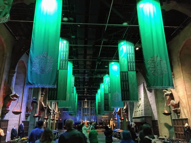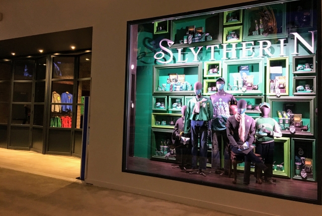スタジオツアーでは、季節ごとにテーマを決めてディスプレイを変えるので、来場者はいつ訪れても特別仕様を楽しむことができます。この日はホグワーツ(Hogwarts™)魔法魔術学校の4つの寮のうちのひとつである「スリザリン(Slytherin™)」がテーマだったため、館内はいたるところにテーマカラーである、グリーンとシルバーを配した小道具や衣装などが散りばめられていました。