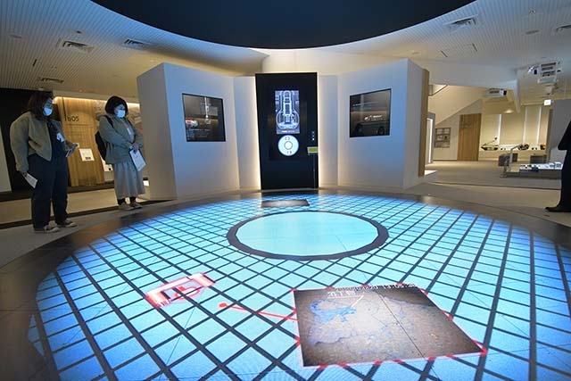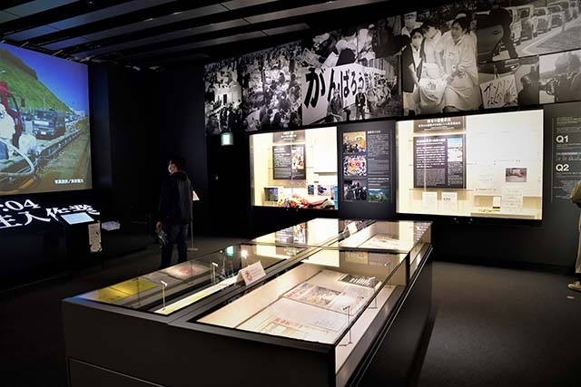 では館内へと入ってみましょう。建物は3階構造であり、1階のプロローグシアターで俳優・西田敏行さんのナレーションによる約5分間の動画を視聴した後に、壁面に描かれた年表を見ながら、らせん状のスロープを上って2階の展示室へと移動します。展示室は「災害の始まり」「原子力発電所事故直後の対応」「県民の想い」「長期化する原子力災害の影響」「復興への挑戦」という各テーマごとに5つのエリアに分かれています。また各エリアとも実物資料に加えて、デジタルコンテンツによる「証言映像」により、震災当時の出来事を臨場感をもって見学できるように工夫されています。