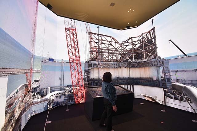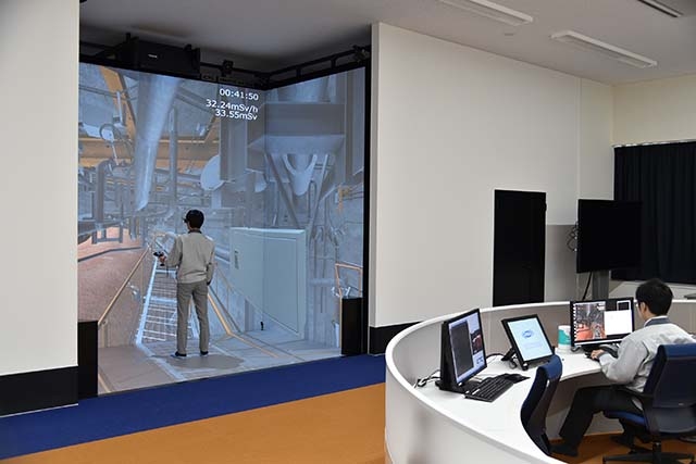 楢葉遠隔技術開発センターは研究管理棟と試験棟の2つの施設に分かれています。まずは、研究管理棟のほうで施設全体の説明を受けてから、バーチャルリアリティ(VR)システムの見学・体験へと移っていきます。このVRシステムは、人が入ることができない現場での作業をシミュレーションするために開発されたものです。あたかも原子炉建屋内を移動しているような3D映像を前にすると、その精度の高さゆえに不思議な没入感がありました。