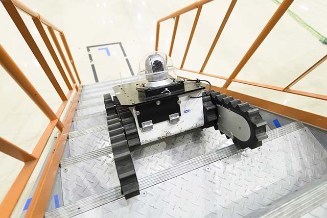 次に試験棟に場所を移して、ロボット試験用水槽、モックアップ階段などの設備を見学していきます。例えば、原子炉内部は水没しているところが多いため、水中でロボットを操作する必要があります。そのための設備として、ロボット試験用水槽が利用されています。また、原発内には様々な階段が配置されているそうで、そういった現場での作業を想定したロボットの昇降動作試験を行うためにモックアップ階段が利用されています。