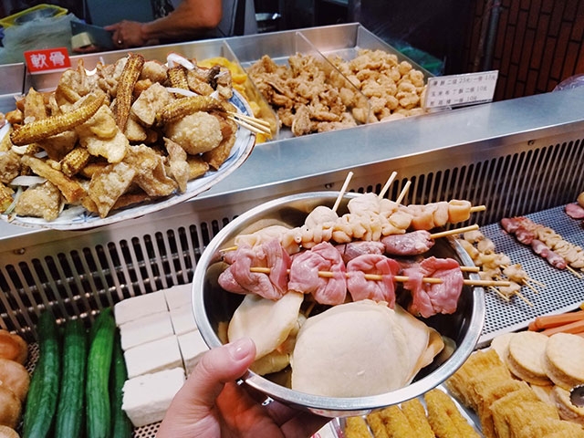 台湾の夜市や街角でよく見かける唐揚げのこと。店頭に並べられた食材から好きなものを自分で選び、店の人がその場で揚げてくれるシステム。食べやすいサイズにカットしてくれるので、雞排よりも食べやすくて、野菜もとれます。食材はさまざまで、鶏肉(鶏皮や砂肝など部位を選べることが多い)のほかに、ベビーコーンやインゲン、サツマイモなどの野菜、キノコ類、豆腐、練り物、ピータン、ウインナーなどバラエティ豊富。個人的なおすすめは、鶏皮とベビーコーンです!