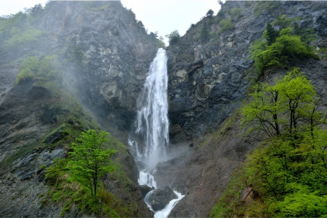 「ふくべの大滝」は、落差が86mもあり、時には水しぶきが道路をおおうこともあります。駐車場のすぐ近くに滝つぼがあり、水が断崖を流れ落ち、むき出しの岩に衝突するダイナミックな景色は圧巻です。