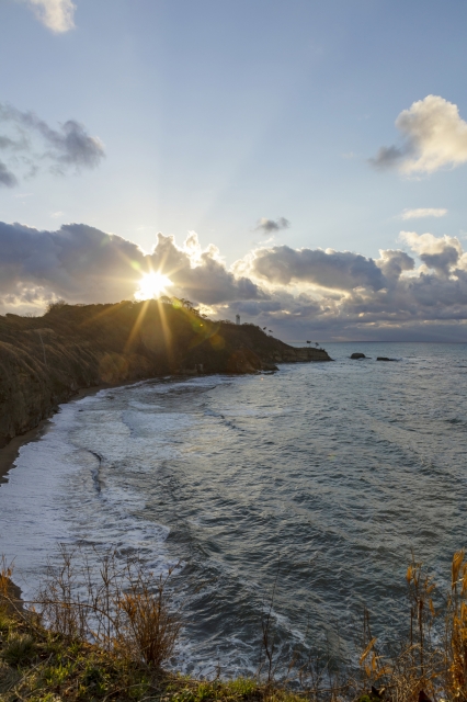 「加佐の岬」は、加賀海岸で最も日本海に突き出した岬で、白亜の灯台が美しいコントラストを描いています。岬の先端から左右に日本海の大パノラマ展望が開けた絶好の景勝地で、特に夕日が日本海に落ちる姿は絶景です。また、岬からは片野海岸まで自然遊歩道が続いているため散策ができ、近年はパワースポットとしても知られています。