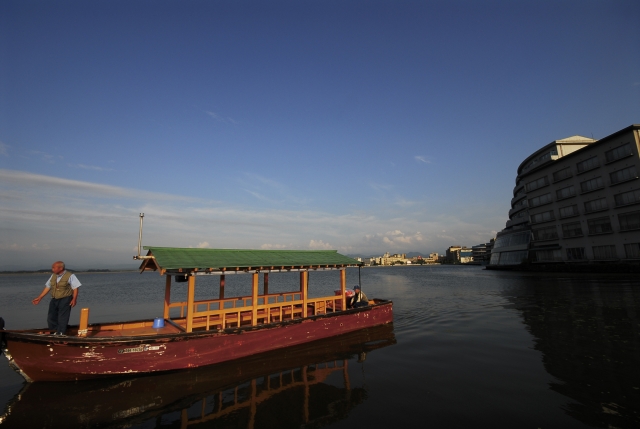 屋形船の運航も始まり、湖畔の自然や湖上に浮かぶように建つ浮御堂や大噴水など、片山津ならではのすばらしい景色を堪能できます。特に天気のいい日に見える霊峰白山は絶景です。屋形船に乗ってさわやかな風や自然の雄大さを全身で感じることができます。