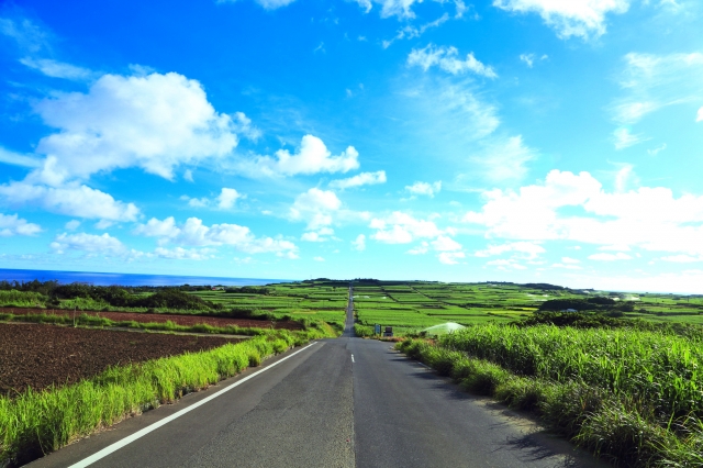 隆起珊瑚礁でできた島である喜界島の中央にのびる一本道。サトウキビ畑が左右一面に広がる2.5kmのまっすぐな道は写真撮影にも人気のスポットです。