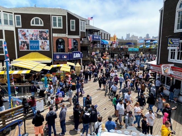 一時期は閑散としていたフィッシャーマンズ・ワーフ。2021年3月から徐々に人が戻り始め、6月中旬以降は国内からの観光客を中心ににぎわう状態まで戻りつつあります。レストランや小売店が多く立ち並ぶピア39は、桟橋が人で埋め尽くされるほどの混雑ぶりです。