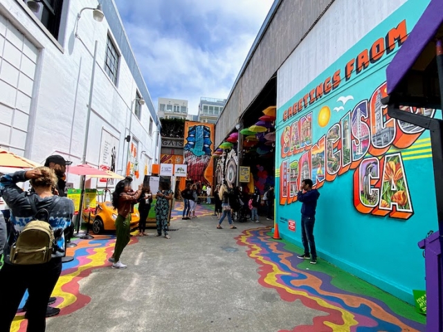 セグウェイを使ってツアーを行う会社の敷地内にありますが、誰でも気軽に立ち寄ることができます。ギラデリチョコレート工場からすぐそばの場所で、ビーチ通り沿いにエントランスがあります。名前の通り、色とりどりの傘が頭上を飾る小さな路地では、カラフルな壁画やオブジェと共に自撮りが楽しめます。特に「サンフランシスコからご挨拶」と描かれた壁画は、サンフランシスコ旅行の記念写真に最適です。