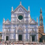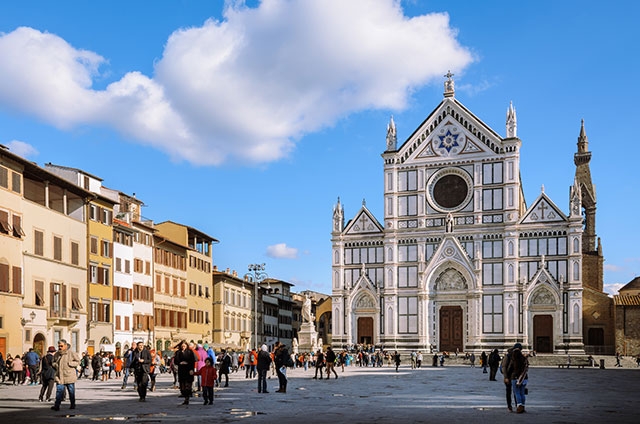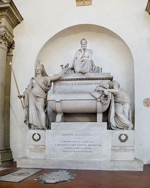ミケランジェロ、ガリレオ・ガリレイ、マキャベッリ、ロッシーニなど、イタリアを代表する偉人が眠るサンタ・クローチェ聖堂。ダンテの墓はフィレンツェにはなく、1829年に墓の形をした記念碑が作られました。ダンテの下の女性は、「イタリア」と「詩」を表現した彫刻です。