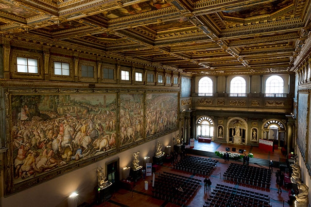フィレンツェ共和国の政庁として、現在は市役所として使われているフィレンツェの政治の中心、ヴェッキオ宮には、ダンテのデスマスクが展示されています。デスマスクは、『神曲』地獄篇を下敷きにした物語が展開する映画『インフェルノ』でもキーアイテムになり、大きな五百人広間も登場しました。ここは共和制時代の市民会議を開くために15世紀の終わりに作られた場所で、天井と周囲の壁の壁画装飾は、16世紀後半にコジモ1世の依頼でヴァザーリの工房が手がけました。