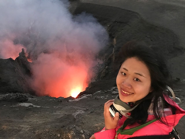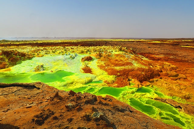 大自然に触れる旅は、確実にお目当ての風景が見られるわけではない。実は彼女の火山デビューはエチオピアだった。「エルタアレ火山を目指したんですが、ダナキル砂漠を通って、火山の麓から夜中に4時間くらいかけて登ったのに、噴火後だったせいで噴煙で何も見えなかったんですよ。あんなにしんどい思いをしたのに!」と悔しさを思い出す。せめてもの救いはダナキル砂漠にあるもうひとつの火山・ダロル火山を見られたこと。「海抜下にあって、“世界で一番低位置にある火山”と言われているんですが、まるでナメック星のような不思議な風景なんです。ポコポコと硫黄を発していて、歩いていると厚手の靴の底がベリっとめくれちゃうくらい熱いんです。替えの靴を用意していなかったから急遽現地で調達しました。」
