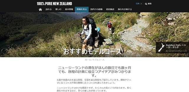 ニュージーランド政府観光局のウェブサイトには、「おすすめモデルコース」のページがあり、滞在日数や旅のテーマ、訪問地などさまざまな切り口から旅程プランを探せます。