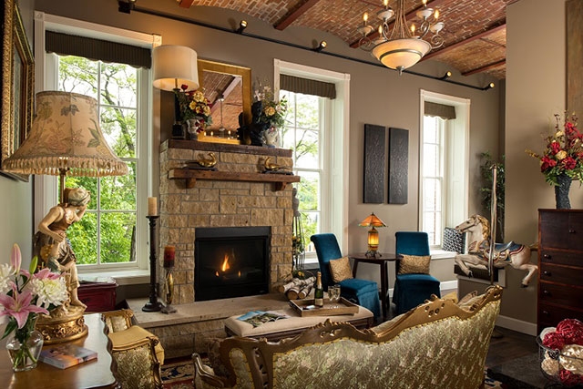 ガリーナには、チャーミングで個性的な宿泊施設がいくつもあります。そのうちのひとつ、ゴールドムア・インは、かつて屋敷だった建物を改装したカントリー・イン。三角屋根の塔に煙突といった外観でひっそりと森のなかにたたずむ様は、まるで物語の世界から抜け出してきたかのよう。それぞれインテリアが異なるスイートルームのほか、緑あふれる敷地内には丸太造りのキャビンやカントリー調のロマンティックな調度品でまとめられたコテージが点在し、窓越しに優雅なミシシッピ・リバーの流れを感じながらゆったりとした滞在が楽しめます。