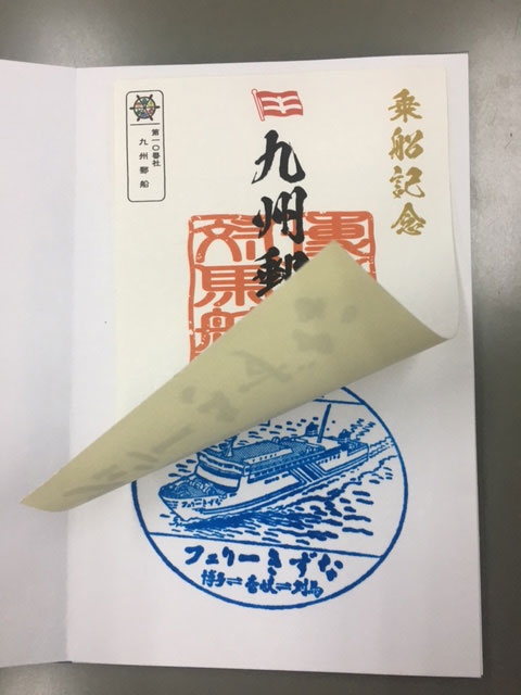 北九州の博多、唐津から壱岐・対馬を結ぶ九州郵船の御船印は「めくれるデザイン」が特色。御船印の裏がシールになっていて、シールの下には船の乗船記念スタンプが押せる二重構造になっています。