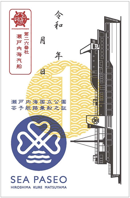 広島と愛媛をつなぐ瀬戸内海汽船は、船の形をデフォルメせず縦に配置した斬新なデザインです。御朱印に倣い、中心の波、船体、航路名など個別のスタンプを作り、乗船スタッフが御船印帳に押印して御船印が完成します。