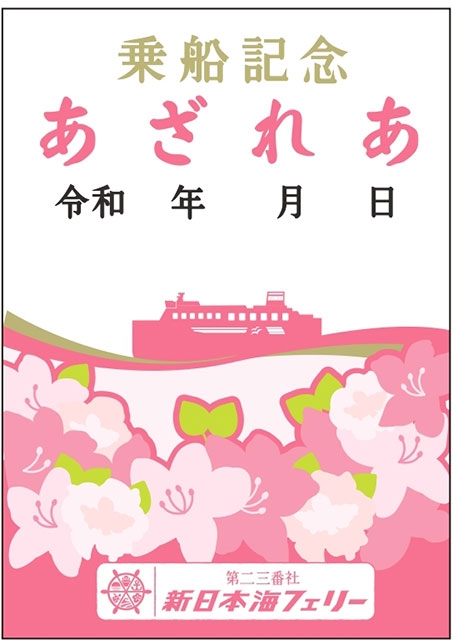 日本海を舞鶴・敦賀から新潟、秋田、小樽、苫小牧を結ぶ新日本海フェリー。船名は港に自生する花木から命名されていて、御船印にも船名の花が配されています。カラフルで目を引くデザインは、列車のヘッドマークをイメージしたそう。