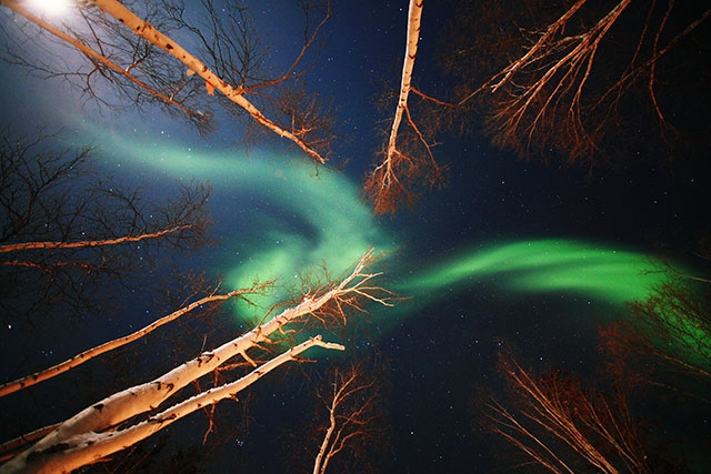 オーロラはただの光ではなく、カーテンのひだのように動いています。これは、微粒子が地磁気極に引き寄せられているため。オーロラを見る角度によって形や動き方が異なり、横からはカーテン型やアーチ型、下からは頭上に弾けるコロナ型や渦巻型などがあり、その形は刻々と変化しています。