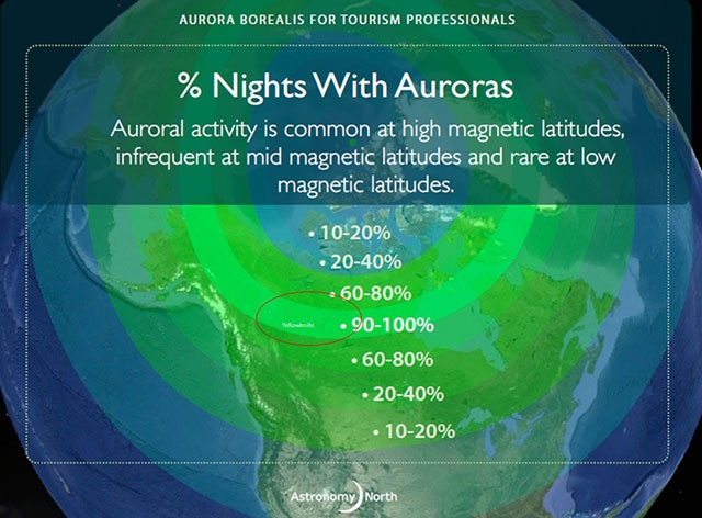 オーロラ・オーバルのほぼ真下にあるノースウエスト準州は、オーロラ鑑賞に最適の地です。内陸部のため晴天率が高く、年間240日以上もオーロラが鑑賞できます。鑑賞にあたって知っておきたい5つの基本情報をご紹介。