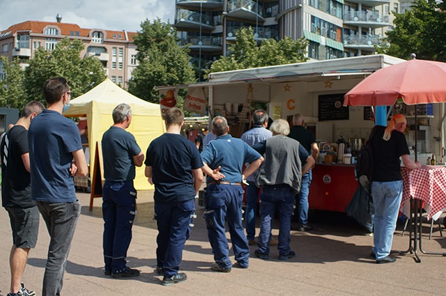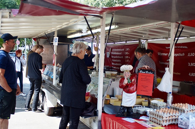 数あるベルリンで開催されるマーケットのなかでも規模の大きいヴィンターフェルト広場のマーケットはひときわ賑わいます。焼き魚、ピザ、バーガー、パンなどその場で食べられるものを提供する屋台や、チーズやハムの専門店が軒を連ね、昼時には行列も。お店を覗いてみると、ベルリン名物カリーヴルスト(カレーソーセージ)で人気の店でした。