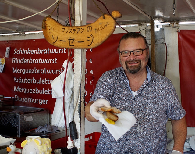 「クリスチアンのおいしいソーセージ」に立っているこのオーナーはベルンハルトさんだそうです(笑)。前のオーナーが掲げた看板がそのままになっているのだそう。