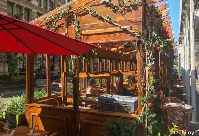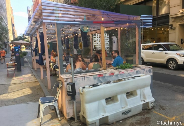 昨年の新型コロナウイルス感染拡大を受け、ニューヨーク市のレストランでは店内飲食が禁止となりました。悲鳴をあげたレストランの救済措置として、店先の車道や歩道を利用したアウトドア・ダイニング(屋外席)が許可され、各レストランは一斉に屋外席を設置しました。コロナ禍のニューヨークにおいて、こうした屋外席を設置する大工さんと、ニューヨークから脱出する人が手配した引越業者とはフル稼働で、特需ビジネスとも言われたほどです。2021年2月~各レストランは入店可能人数を段階的に増やし、店内飲食を再開しています。