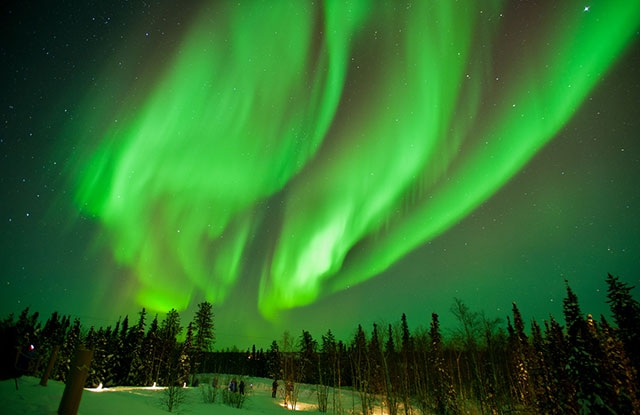 内陸部にあるイエローナイフは、冬の降水量が少なくオーロラ観賞に最適な場所です。またオーロラが発生するオーロラ・オーバルの真下に位置しているため、大きなオーロラが出た場合は頭上で弾けるオーロラが観賞できます。