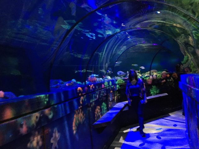 いよいよ展示エリアに一歩踏み入ると……ブルーや紫など、七色にライトアップされた天井アーケードがとにかく目をひき、そこが水族館であることを一瞬忘れてしまうかのような圧巻の光景です。