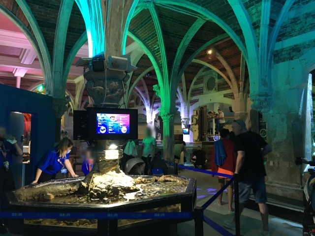 昼夜の海を体験する「Day & Night Ocean Experience 」コーナーでは、まるでプラネタリウムのような星空とさざ波が広がる美しい映像が流されており、波が打ち寄せるさまは本物のようで、思わず足が濡れないよう跳びよけてしまいます。