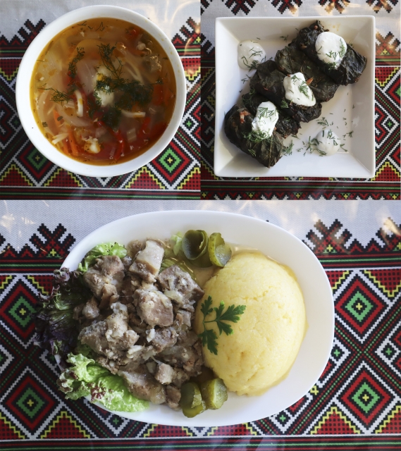 2品目はサルマーレ。挽肉と野菜、お米をトマトベースで味付けし、モルドバ産のブドウの葉でまいてオーブン焼きした料理。上にはモルドバから持ってきた乳酸菌を使って作っているというサワークリームをかけていただきます。口の中でほのかにブドウの香りが立ち、中から肉汁もあふれます。