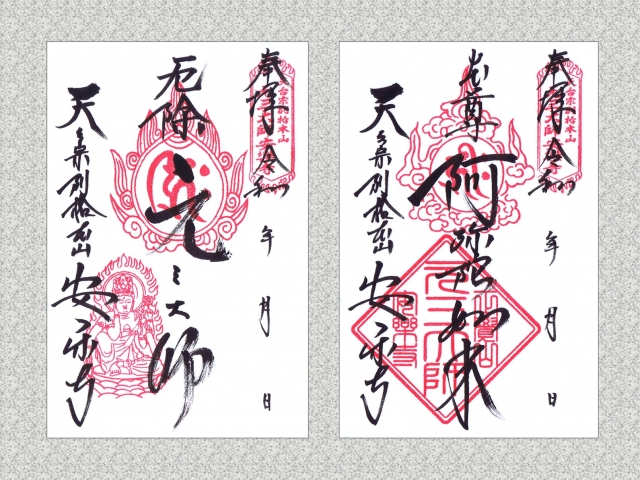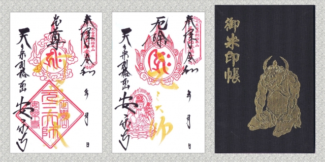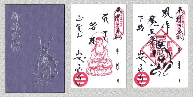 御朱印は上掲のほかに、お寺のオリジナル御朱印帳限定のものがあります。御朱印帳は2種類で、それぞれに2つの御朱印が書き込まれています。なかでも元三大師の病魔退散の形相を写した角大師の御朱印帳は、毎月3日のみに頒布。そこに書かれた御朱印はなかなか手に入らない希少なものなので、あえて3日を選んで訪れる価値大です。
