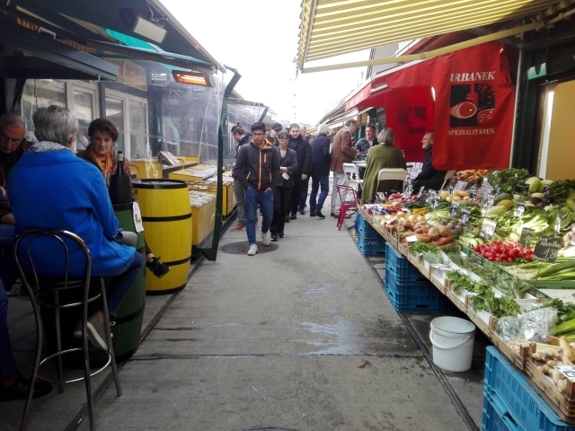 ナッシュマルクトはウィーンでも最大級の市場と言われているだけあり、観光地化されたイメージがありますが、利用客は旅行者のみならず、ウィーンに住む地元民も少なくありません。特に市場の所々にある立ち飲みスタンドやビストロはウィーンの老若男女に人気で、コロナ禍以前は朝から晩まで賑わっていました。