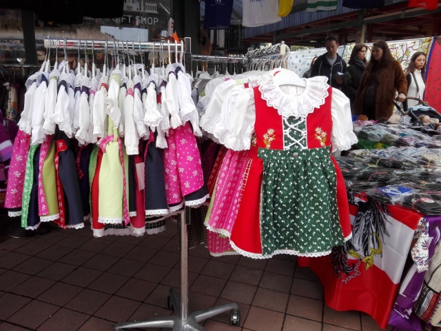 ドイツ語方言で「お嬢さん」を意味するディアンドルの子供用は旅行者に大人気。かさばらずに持ち歩きも簡単なお手頃価格の子供用ディアンドルは、オーストリア土産にピッタリ!奥には男の子用のズボンもあります。
