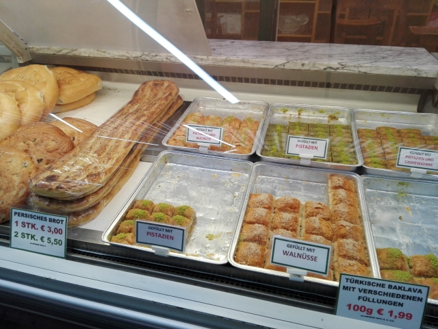 簡単に食事を済ませたい時や、歩き疲れた時に体力を充電するのにお勧めなのが中東のスナック「ファラフェル」を挟んだサンドイッチやケバブ、そして濃厚な蜂蜜が染み込んだスイーツ「バクラヴァ」。味見をさせてくれるので、色々な店をはしごして食べ比べるのもいいですね。