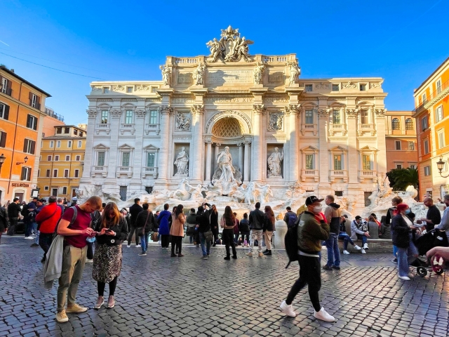 続いて、トレヴィの泉です。イタリアでは、2021年6月28日より、マスクの屋外での着用義務はなくなりました。そのため、トレヴィの泉のような開かれた場所では(この写真のように)マスクをしていない人も見られますが、ソーシャルディスタンスをとって観光することが定められています。