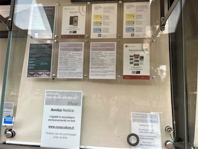 コロッセオ前の切符売り場には、ネット経由でチケットを購入するように注意書きの紙が貼ってあります。