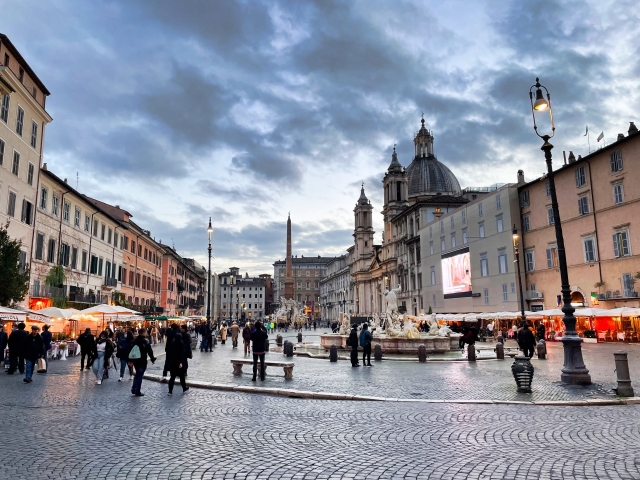 広場の両脇に軒を連ねるカフェやレストランも明かりを灯して営業中です。ローマっ子の夕食の一般的な時間帯は19~20時くらいですので、それよりも早い18時~18時半頃に店内に入ると、まだ混んでおらず、ゆっくりとお食事をとることができるのでよいです。イタリア人や、外国の方には、店の外で食べることのできるテラス席がとても人気です。冬でも寒くてもいつでも外の席が人気です。2021年11月30日現在は、ローマでは、レストランなどの飲食店では、屋外の席に座ってお食事をする場合は、ワクチンの接種またはPCR検査におけるCovid-19の陰性を証明するCOVID-19グリーン証明書(通称グリーンパス)の掲示は必要ありません。建物の内部で飲食をする場合は、COVID-19グリーン証明書の所持が必要となっています。