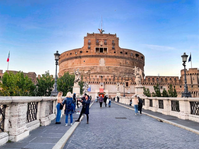 サンタンジェロ城です。イタリア語でサント(聖)とアンジェロ(天使)からなり、聖天使城とも呼ばれます。もともとは、五賢帝の一人ハドリアヌス帝が、お墓(霊廟)として造らせたため、お城といっても普通のお城とは形がだいぶ違っています。こちらも、入口の外まで入場のための列が伸びているのを久しぶりに見ました。楽しい顔で観光スポットの前でお話をするたくさんのお客さんが戻って来て、とても嬉しくなります。